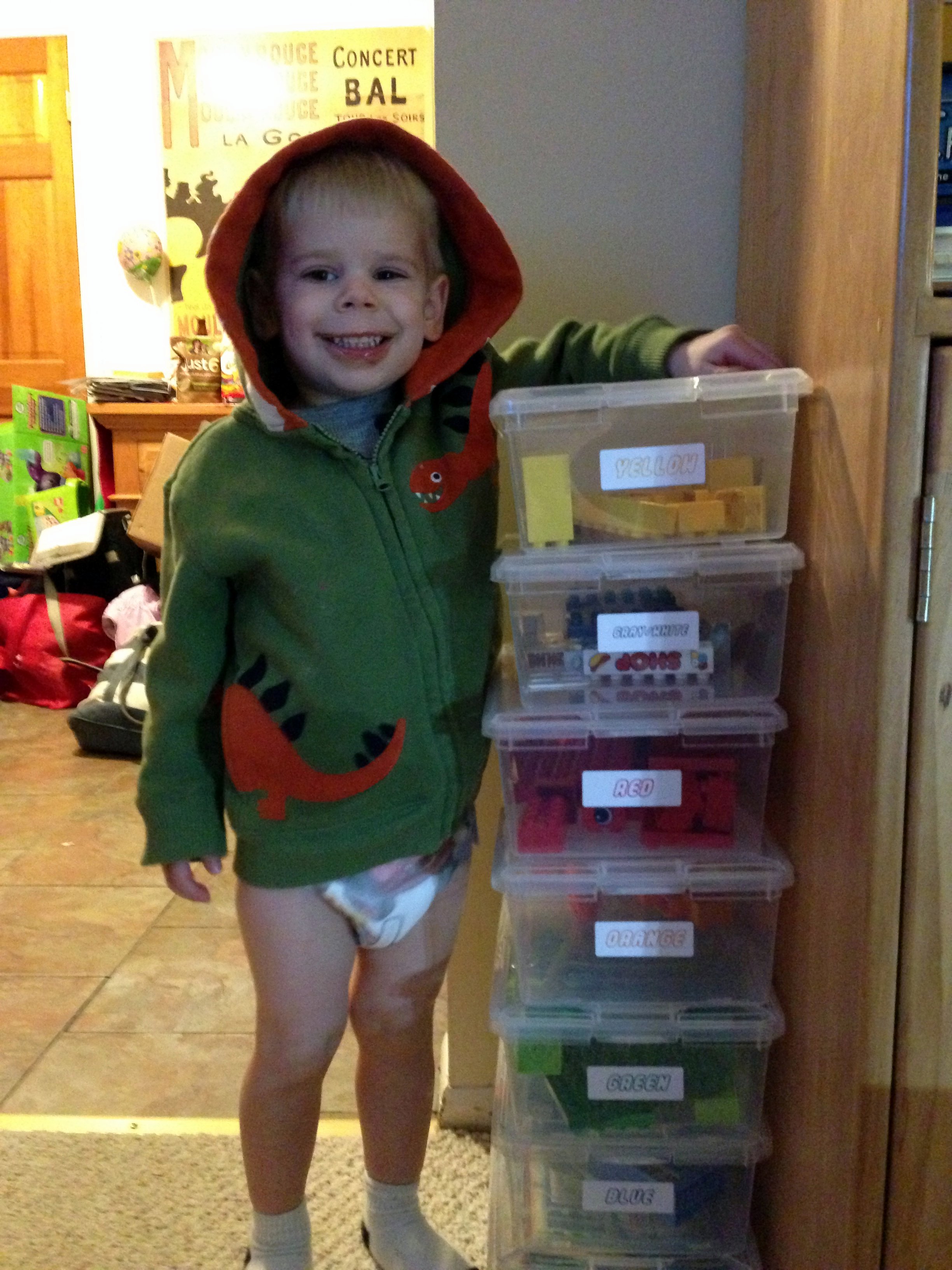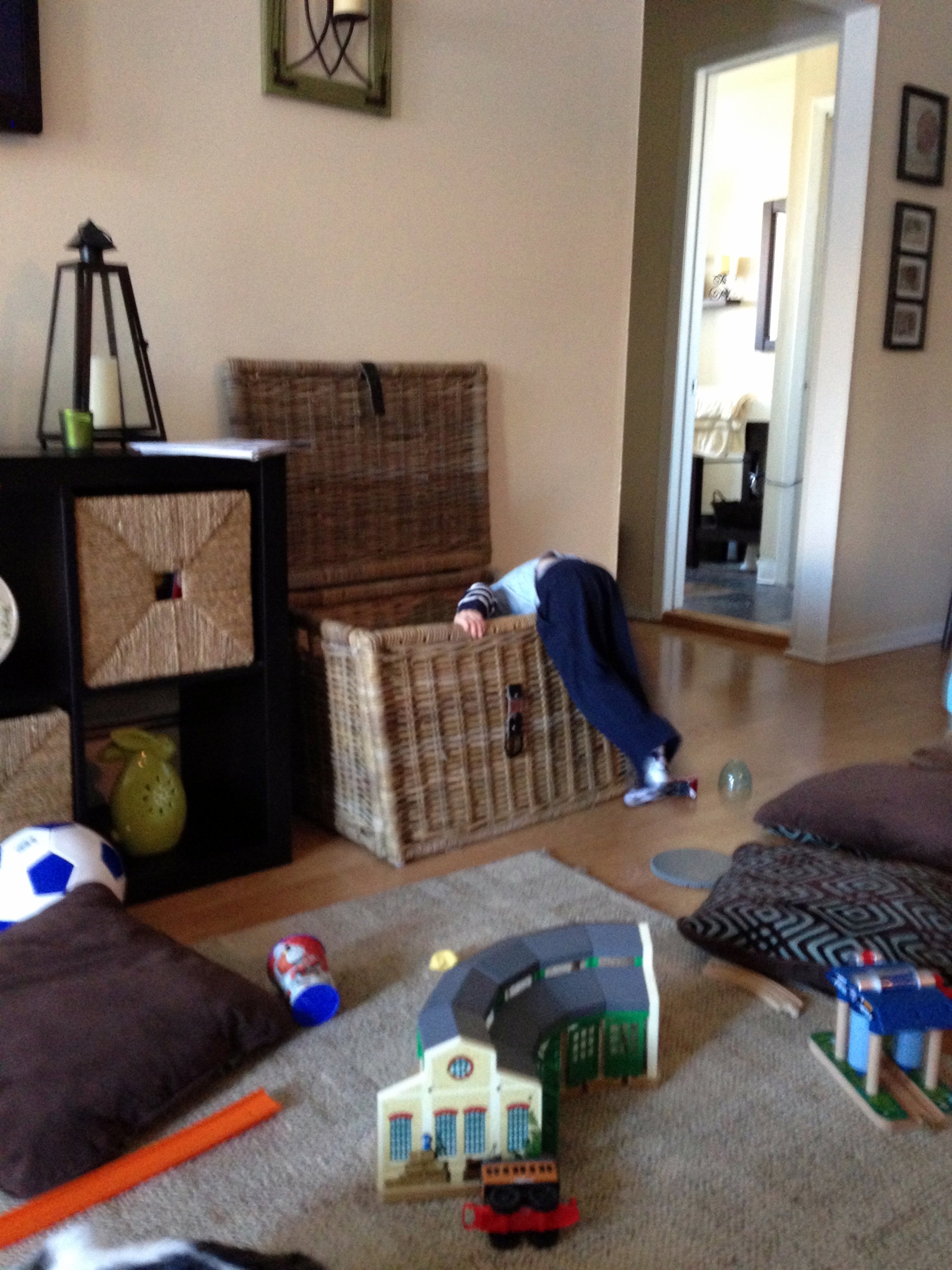 Cole got stuck in the toy bin and almost tumbled all the way in!