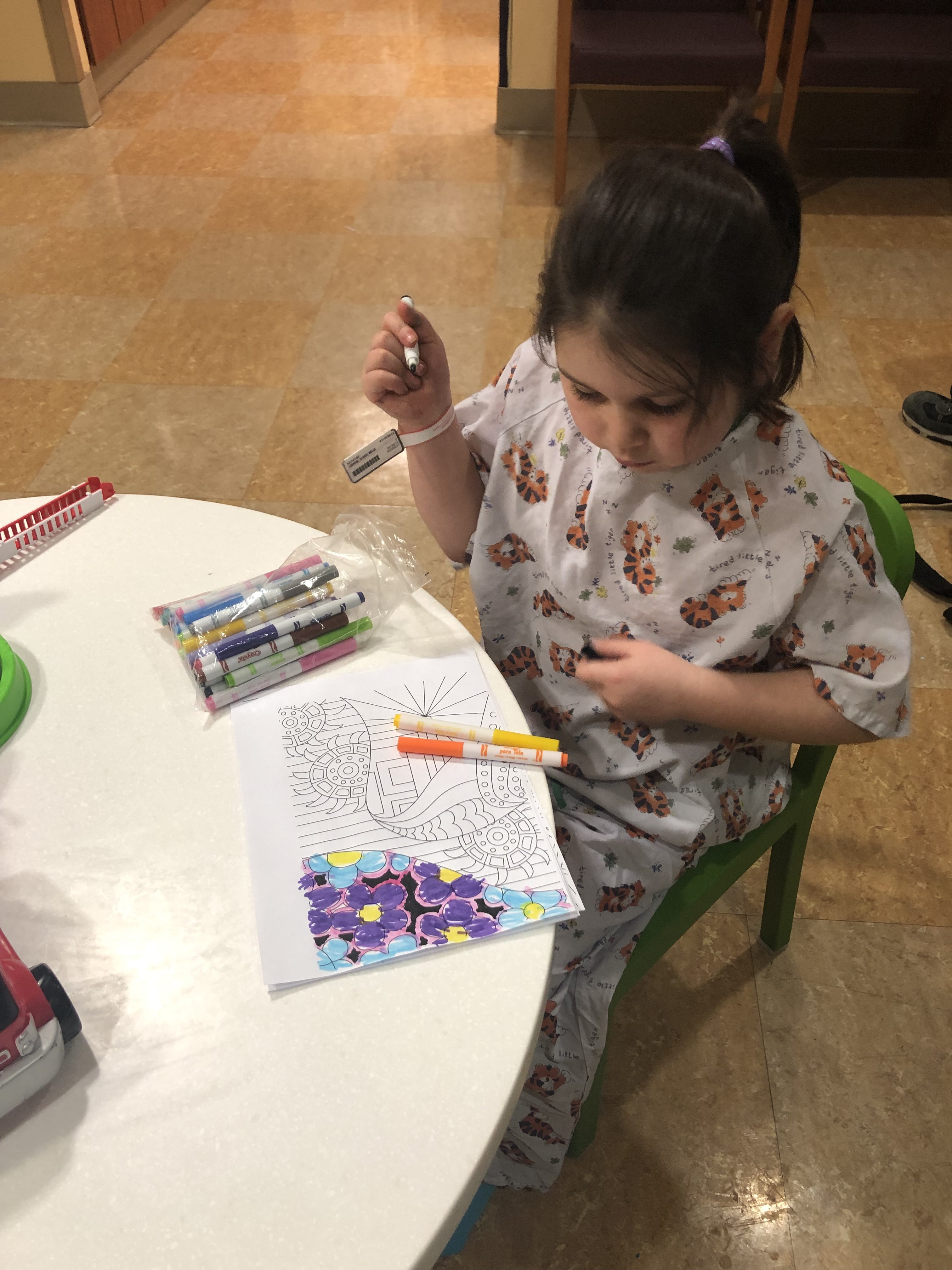 We made it the required 3 weeks of cold and fever symptom free time and got toLu’s appointment early today – no traffic heading into the city. She changed into hospital jammies and calmly played and colored while they took her vitals and we waited for her turn. She was a little nervous, but not terrible.